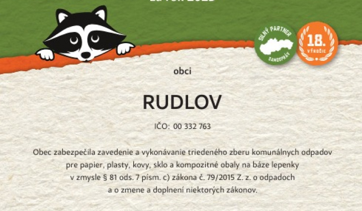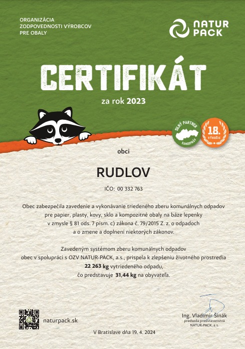 Obec Rudlov získala v uplynulých dňoch certifikát za rok 2023 od spoločnosti NATUR – PACK, a. s., ktorá je zmluvne zabezpečenou organizáciou zodpovednosti výrobcov pre obaly. Spoločnosť NATUR – PACK v ňom potvrdzuje, že občania obce Rudlov v minulom roku vyzbierali celkom 22 263 kg