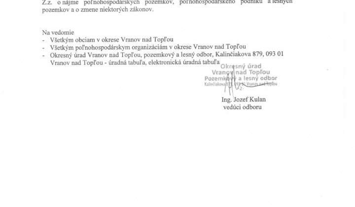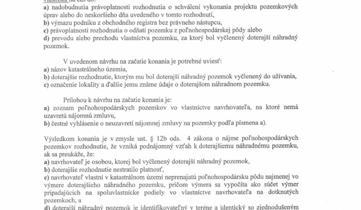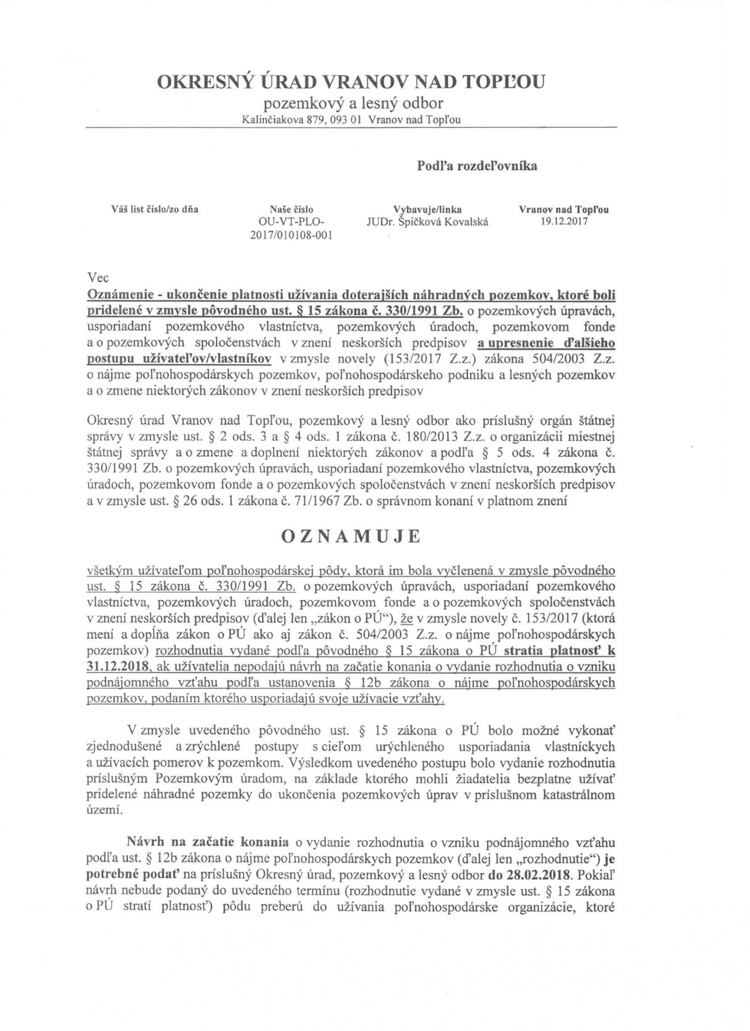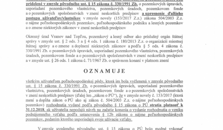 Toto oznámenie je určené všetkým užívateľom poľnohospodárskej pôdy, ktorá im bola vyčlenená v zmysle pôvodného ust. § 15 zákona č. 330/1991 Zb.
