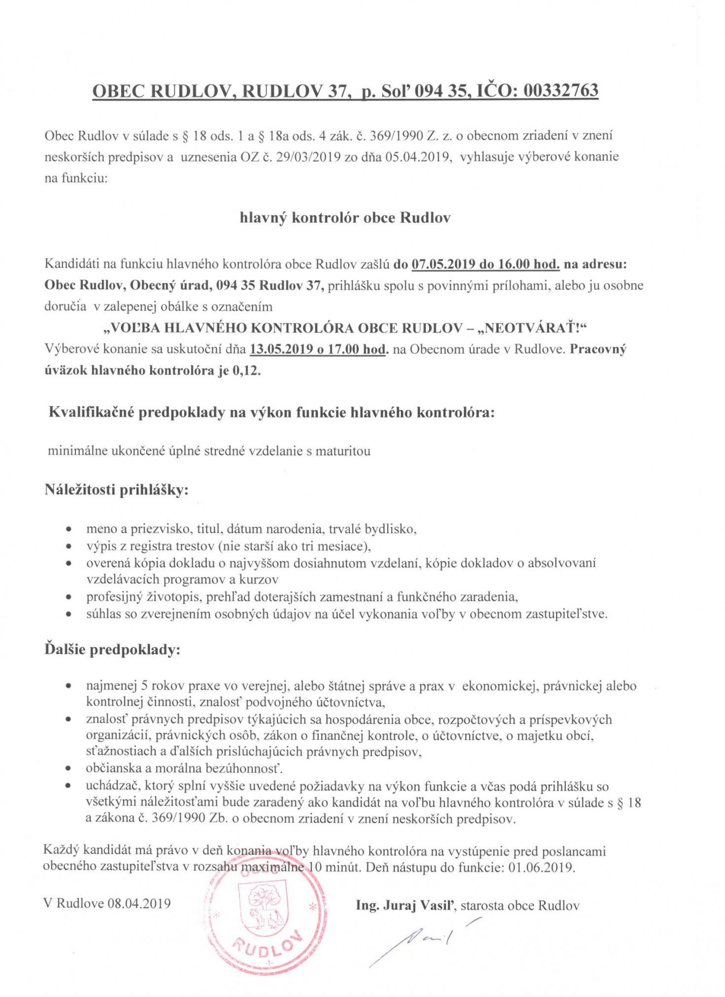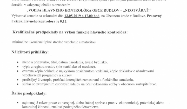 Výberové konanie na funkciu hlavný kontrolór obce RUDLOV