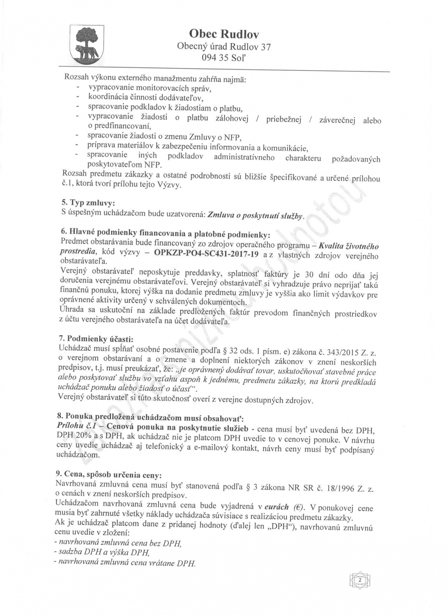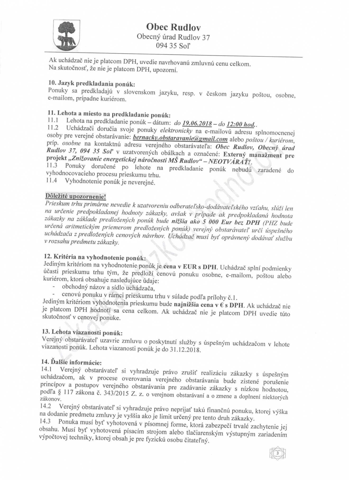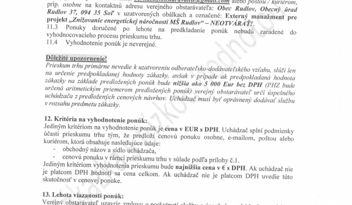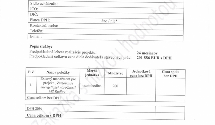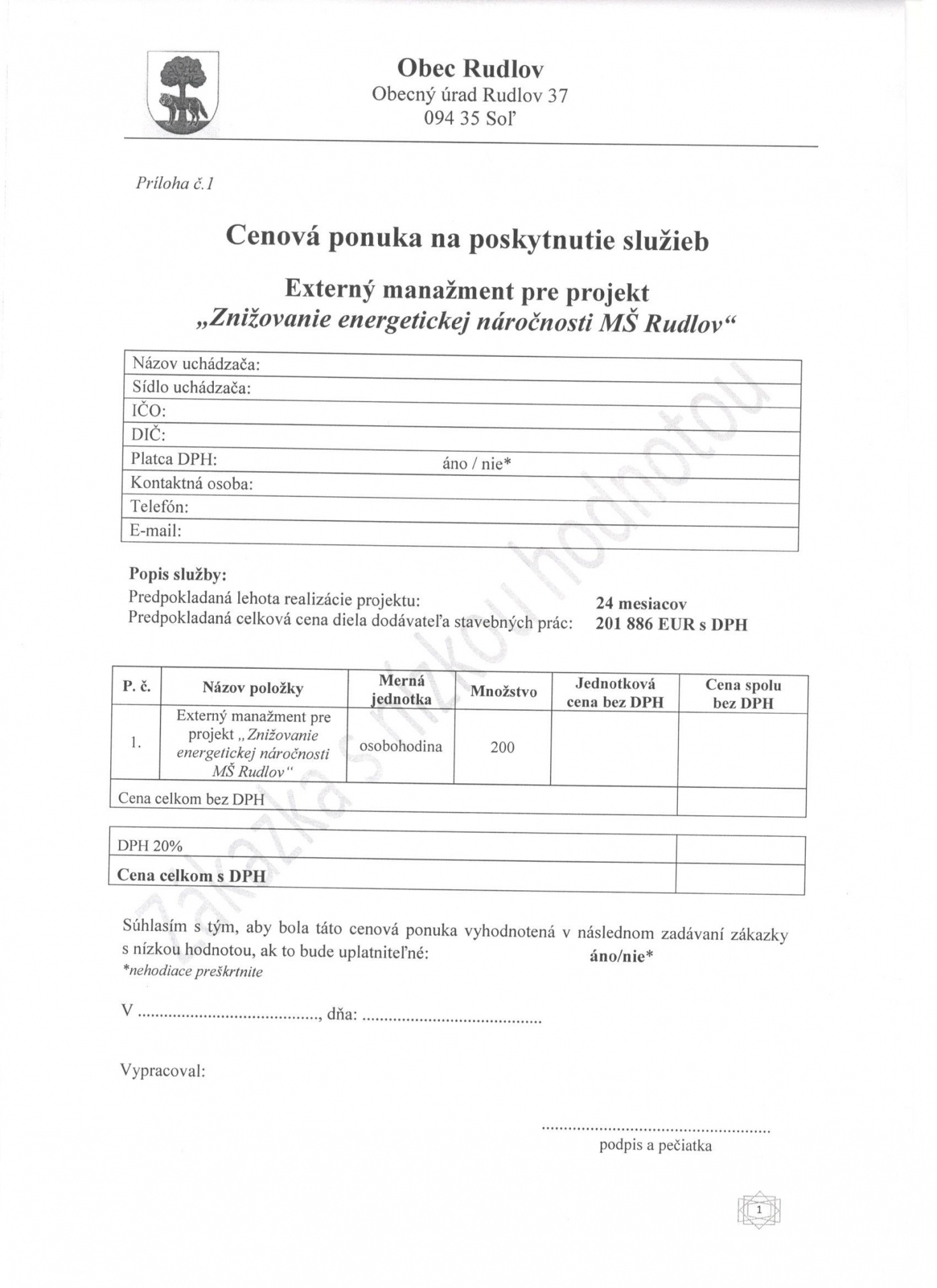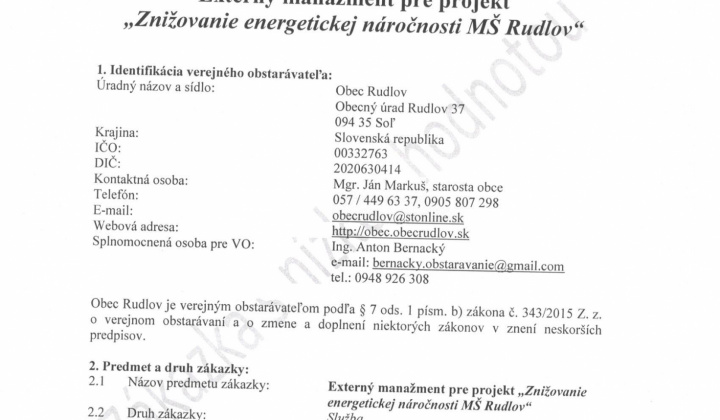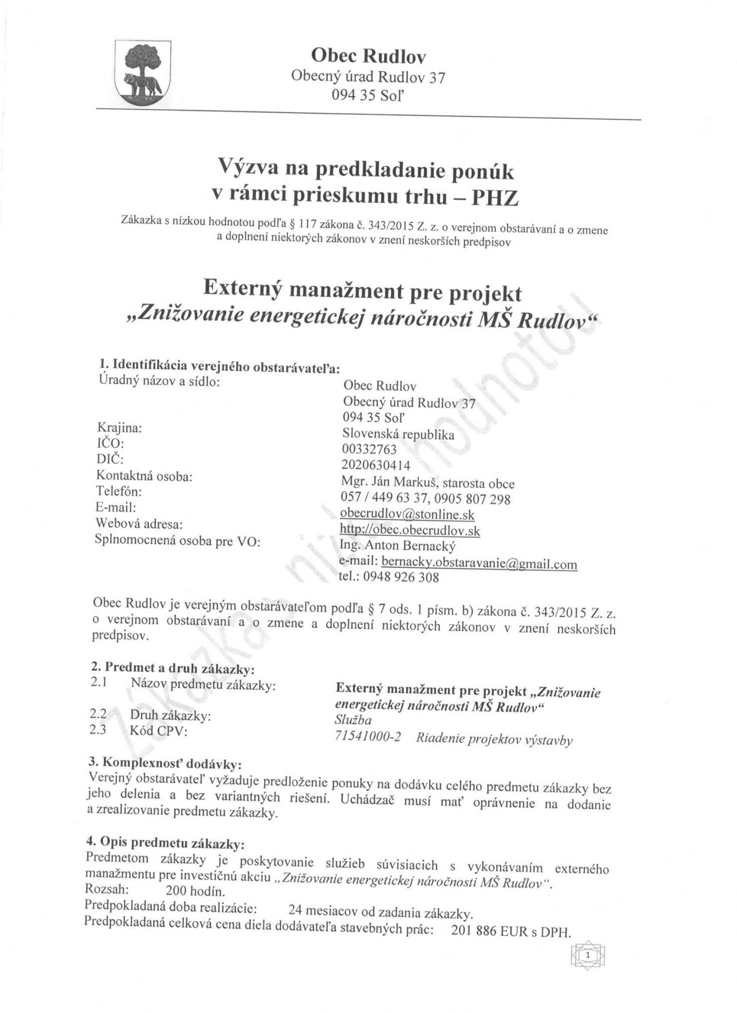 Výzva na predkladanie ponúk v rámci prieskumu trhu – PHZ_Externý manažment pre projekt: Znižovanie energetickej náročnosti MŠ Rudlov
