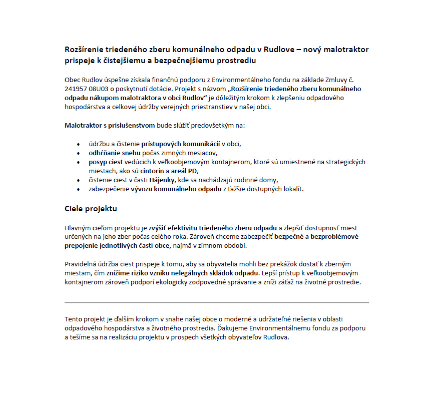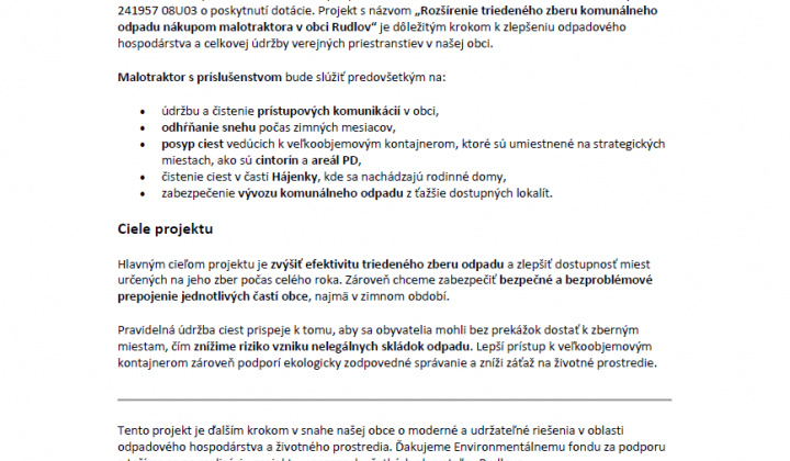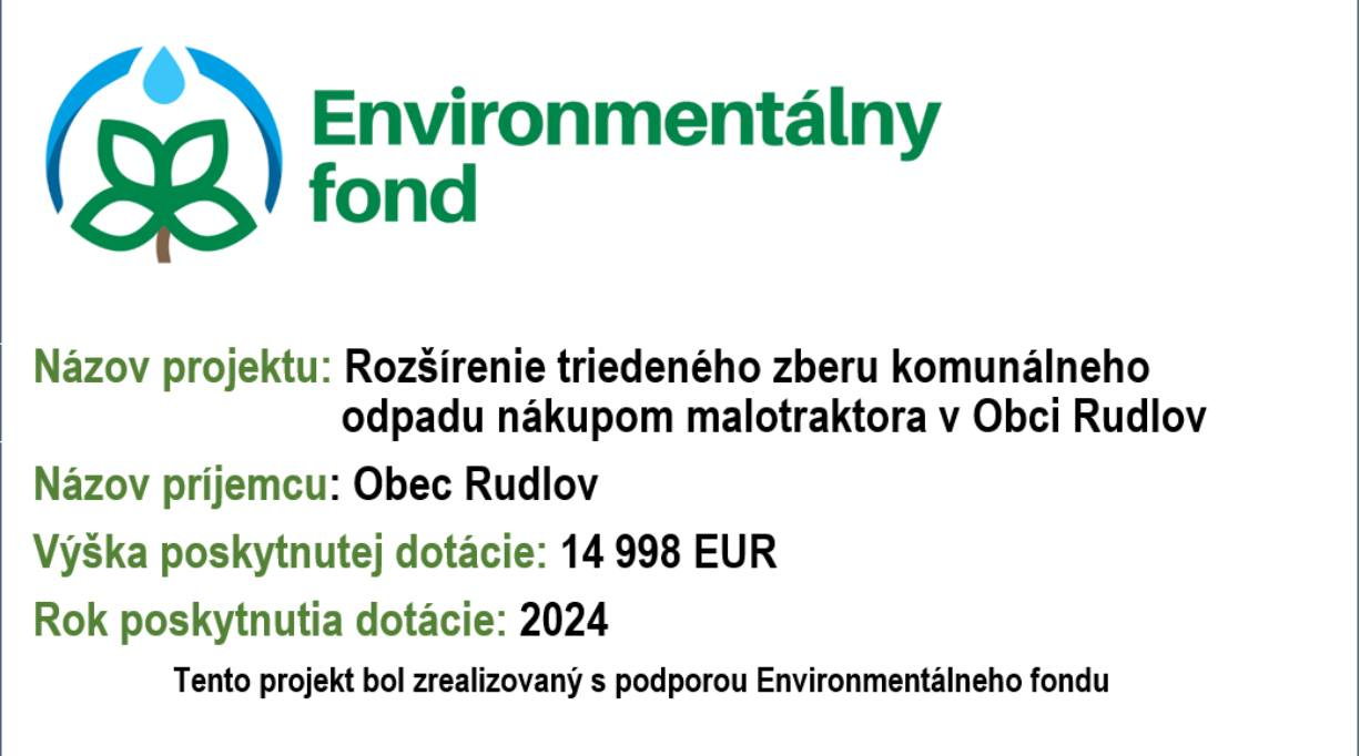 Rozšírenie triedeného zberu komunálneho odpadu nákupom malotraktora v Obci Rudlov